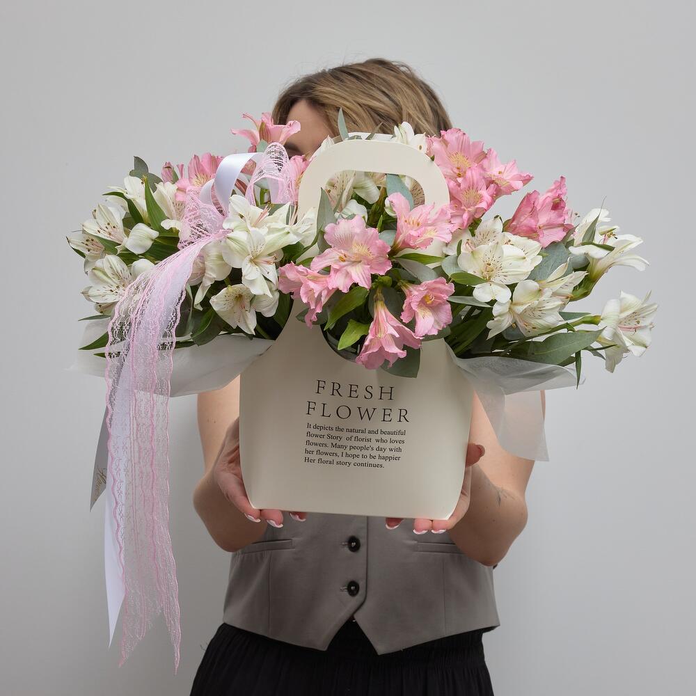 Букет из розовых и белых альстромерий в стильной сумочке в Нестерове