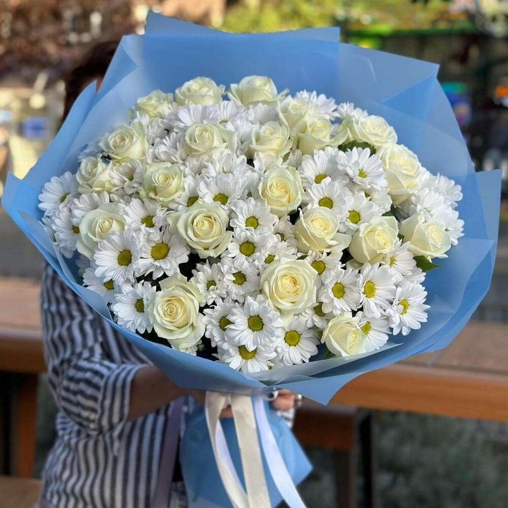 Роскошное облако из белой розы и белой кустовой хризантемы с тыльной оформлении для самых значимых моментов в жизни.